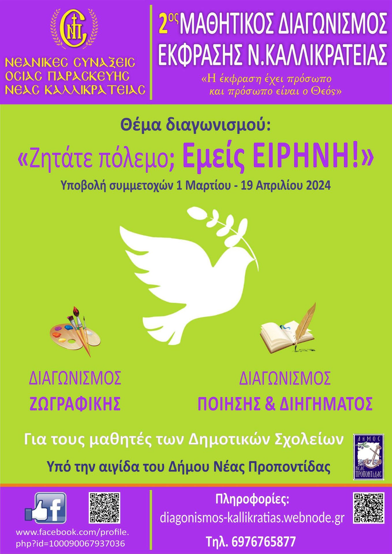 Σας γνωστοποιούμε ότι οι Νεανικές Συνάξεις του Ιερού Ναού Οσίας Παρασκευής Νέας Καλλικράτειας προκηρύσσουν για το σχολικό έτος 2024-2025 τον 3ο Μαθητικό Διαγωνισμό Έκφρασης Νέας Καλλικράτειας «Η έκφραση έχει πρόσωπο και πρόσωπο είναι ο Θεός!».